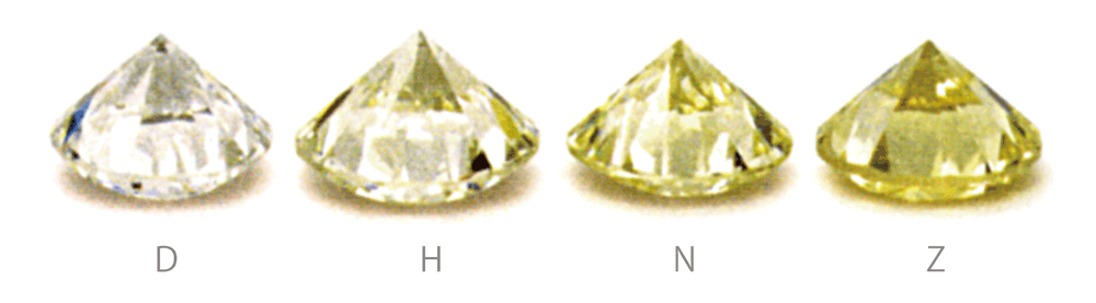 ダイヤモンドは大半僅かな色があります。通常その色はイエロー(黄)かブラウン(茶)色です。 ダイヤモンドのカラーはアルファベットのD(無色)から始まりZ (ライトイエローまたはライトブラウン)まで続きます。